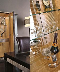 4-х дверная витрина, 2 центральные дверцы декорированы кожей. Полки выполнены из стекла. Возможны другие варианты отделки.