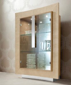 2-х дверная витрина с подсветкой, полки выполнены из стекла, задняя стенка зеркальная. Отделка — сахарный клен и кожа.