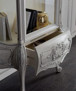 Витрина с выдвижным ящиком, стеклянной распашной дверцей и стеклянными боковинами. Декорирована резьбой. Полки выполнены из стекла. Возможны другие варианты отделки.