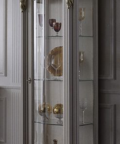 Витрина с 1 стеклянной распашной дверцей. Декорирована резьбой. Полки выполнены из стекла. Возможны другие варианты отделки.