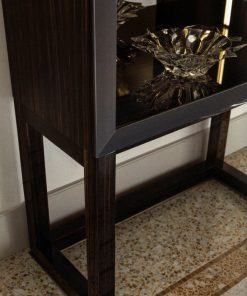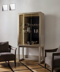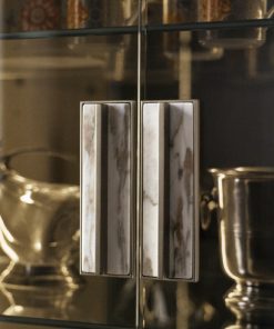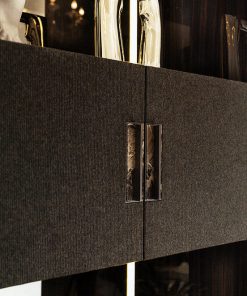 Витрина с двумя распашными стеклянными дверцами, декорированными вставками из кожи или кашемира. Оснащена двумя полками из прозрачного хрусталя, зеркальной задней панелью и подсветкой. Ручки выполнены из мрамора. Профиль основания и рама выполнены из металла. Возможен вариант створок без вставок. Возможны другие варианты отделки и обивки