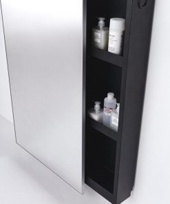 Настенное зеркало с металлическим основанием и внутренними отделением под полки. Зеркало можно сдвигать как в правую, так и в левую сторону. Внутреннее отделение может вмещать до 16-и полок, которые можно регулировать по высоте. Полки заказываются дополнительно